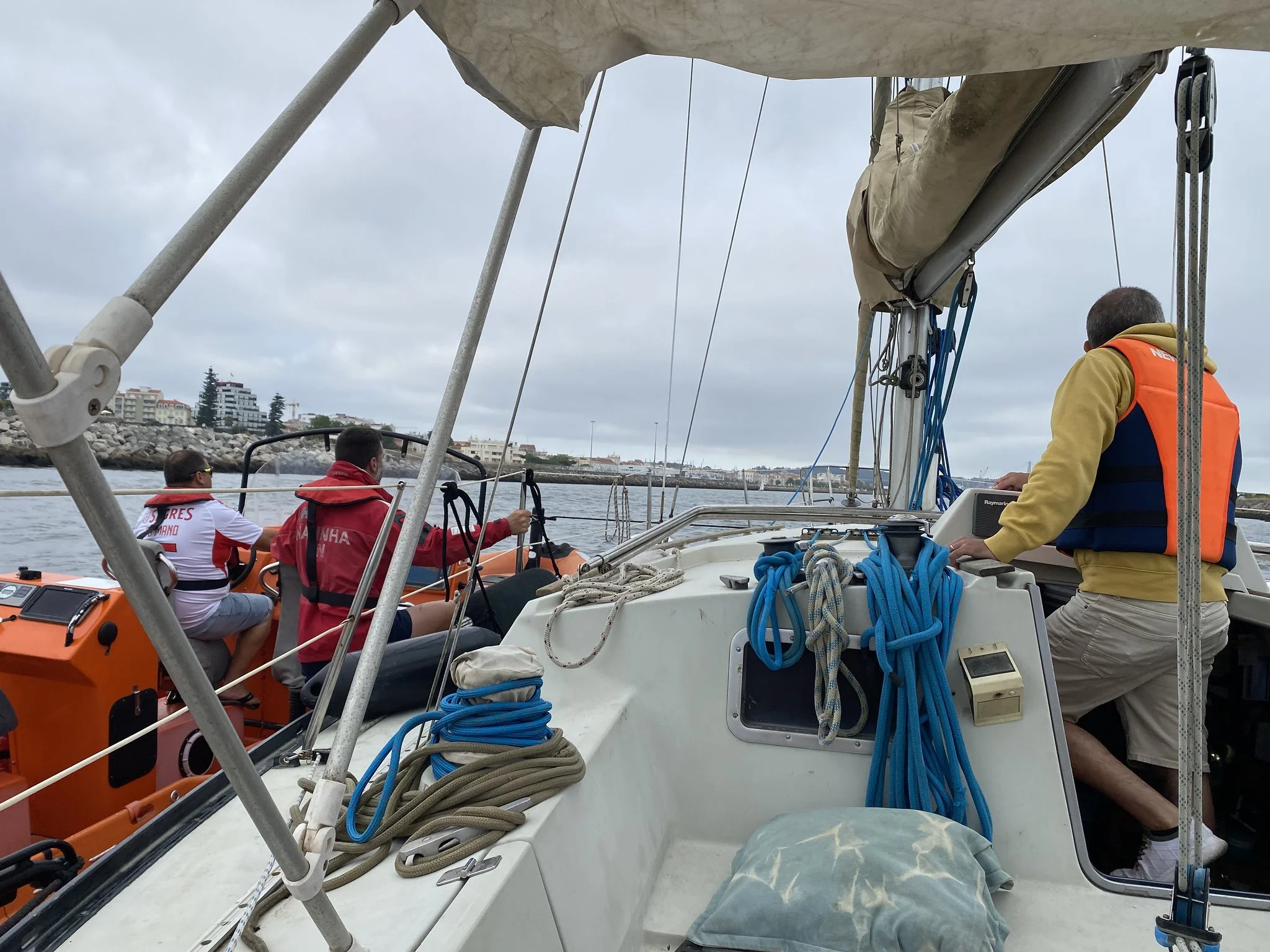 He had to swallow it and went all the way to Figueira, to the entrance of the Figueira Marina, and as I always do, I stopped outside and maneuvered forward and backward to check the systems before docking. I disengaged , put it in reverse and then forward again, the lever stayed in the central position (uncoupled) and I couldn't re-engage it for anything. I thought the cable had probably snapped or something. The guy panicked, "Let's call a mayday, are you crazy, man? We're 200 meters from the breakwater, zero waves and zero wind, 10 meters deep, whatever happens, we'll drop anchor and call a tow, but for now we're not drifting or in any kind of danger, just stay calm." I called the marina and requested a tow to our mooring post. Upon arrival, we were met by the maritime police at the dock. They checked our documents, asked what had happened, everything was okay, and advised us to go to the harbor master's office before continuing our journey for formalities. They even recommended a mechanic to help out… nice guys.
