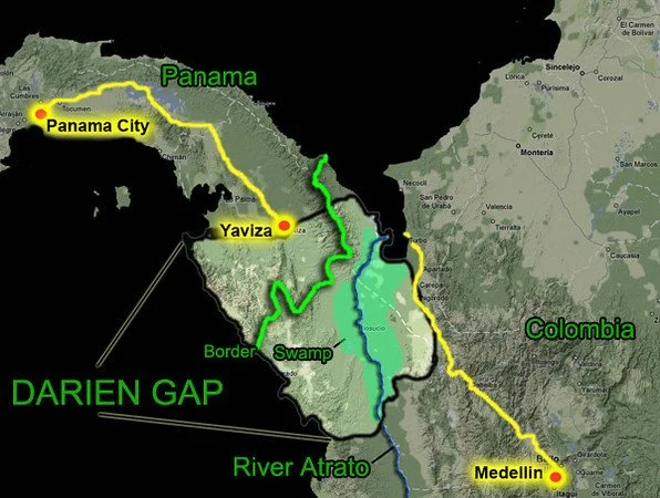 Darién Gap, an approximately 60-mile (100-km) break on the Pan-American Highway, which otherwise runs continuously from Alaska to the southern tip of Argentina. The gap is located in the thickly vegetated marshland and tropical rainforests of the Darién region, which spans the easternmost part of Panama and northwestern Colombia.Travel between the continents through the Darién Gap has long been a challenge. ... "The Darien Gap's Fearsome Reputation Has Been Centuries in the Making" The police did not alow foreigner to cross the River Chucunaque biond that river is a no mans land lnon as Darian Gap.