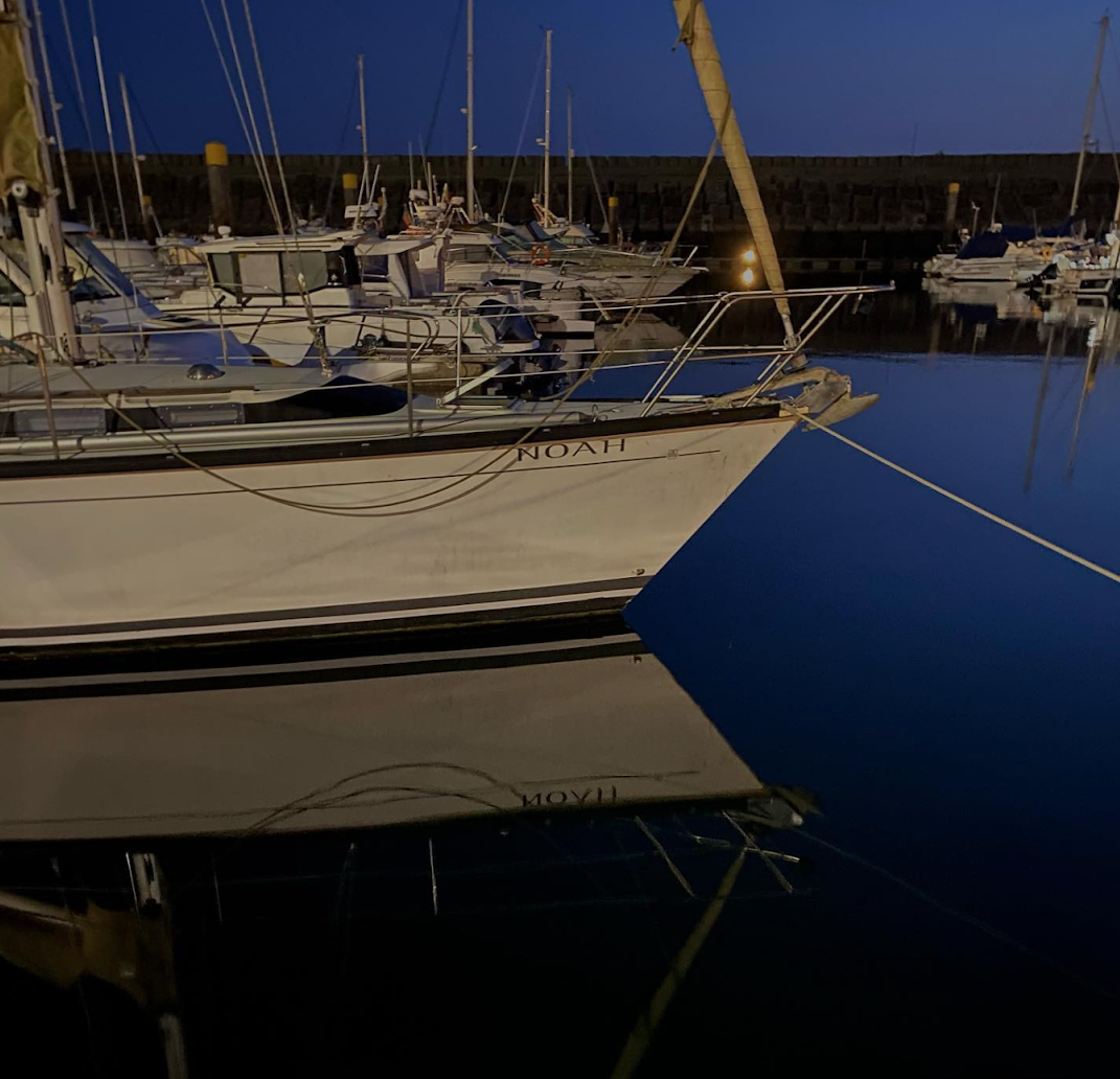 I was lucky that I had a job I genuinely enjoyed, a fantastic circle of supportive friends, and, naturally, my dear family. The moment I could walk again without the wheelchair, I was eager to get back to my job, hop on my motorbikes, and, of course, be out on my cherished boat. However, I quickly discovered that sailing Noah was a lot tougher with my new limitations; even getting onto her was a real struggle. But I did not let the challenge demoralise me, everything is therapy, it's all about getting back to normal. If I do not try I will never know if I can do it or not. following this “mantra” in a way, was a tool for me to recover and show my injured brain how to rewire itself . Anyway just being near the ocean really perked me up. Every time I come to stay in Noah, it was a little bit easier. However, I quickly realized Noah needed some serious upgrades so I could sail her again. As part of my daily walks along the marina pontoons and docks, I was always paying attention to other boats that might have solutions I could adapt to make my life easier on Noah. The first upgrade was instaling second hand self tailing winches, The original ones in Noah where standart and required two hands to operate . I felt great about being able to complete the installation all by myself.while walking on the boatyard to see some swim platform examples I saw the most beautiful thing, It was love at first sight. Belle a Moody 41 Classic with a blue hull and the most elegant lines I ever saw in a sailboat. She had all the items on my wish list and even more I could wish for
