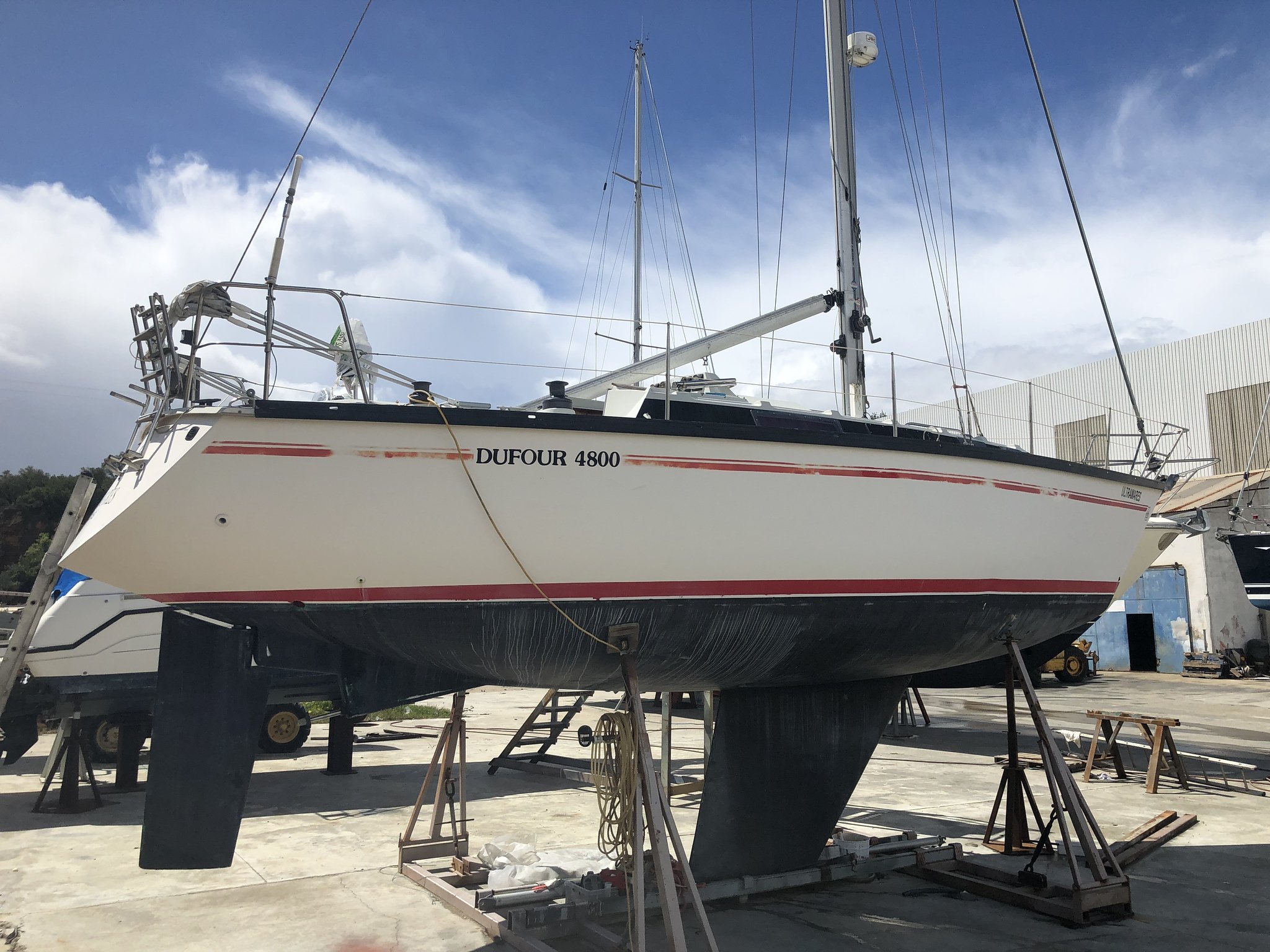 Now was time to extend my knowledge of sailing and become a certified coastal skipper to start learning her lines along the Portugal Coast. I made it to Treino de Mar, a renowned sailing school not far from Noah Berth. And that was what I did in the following months to become familiar with sailing her. We sail frequently to Cascais to taste the ocean outside the river and also practicing mooring and manoovering her in and out of different marinas. After enjoying Sumer in the beautiful Sesimbra and the Arrábida coast It was time to head south on a bigger passage. , this time by myself, first solo sail to Sines, halfway to the Algarve. Sines is the bearth place of Portuguese explorer Vasco da Gama and one of my favorites parts of Portugal coast sinse my speerfishing trips back on my 20”s so it was not difficult to chose as the perfect winter base for Noah. The sail itself was easier than I expected, obviously with some mandatory small problems but nothing I could not fix on the way. a big Pod of dolphins was our only companie for this first single hand sail. I departed early in the morning and arrived to Sines bay at sunset. The idea was to sail her to the Algarve and the Mediterranean the following summer before going on biigger adventures, but in January of the following year, I unexpectedly suffered a hemorrhagic stroke while working out at my gym. Due to this unforeseen circumstance, Noah spent the entire year in Sines. She actually stayed in Sines until 2023, when I was able to sail her to Lagos and the Algarve with the assistance of some close friends. After one year living aboard her in Lagos Marina I sail her back to Sines. She’s Dufour 4800, a 35ft Sloop build in 1983.. She felt safe and sturdy but was dificult to sail singlehanded. All major sail operations had to be performed at the mast, which was challenging for me due to my poor balance and single working hand after the stroke . Even climbing aboard was difficult for me because of her high topsides. However, I always saw that as a challenge rather than an impossibility, and I was able to stay afloat for extended periods of time with persistence and practice. I was constantly looking at other boats in the marina to see if there was any solutions I could adapt in Noah to make my life easier and make her more cooperative with my limitations. The first change was a pair of second hand self tailing winches, The original ones in Noah wher standart and required two hands to operate . I felt great about being able to complete the installation all by myself. My next project for her was a swim platform. Getting back aboard after a swim was a real struggle. But while walking on the boatyard to see some swim platform examples I saw the most beautiful thing. Belle a Moody 41 Classic with a blue hull and the most elegant lines I ever saw in a sailboat. She had all the items on my wish list and even more I could wish for. inmast furling main, swim platform, self tacking jib and what looked like a very robust construction. My first taught was, She’s out of my leage…